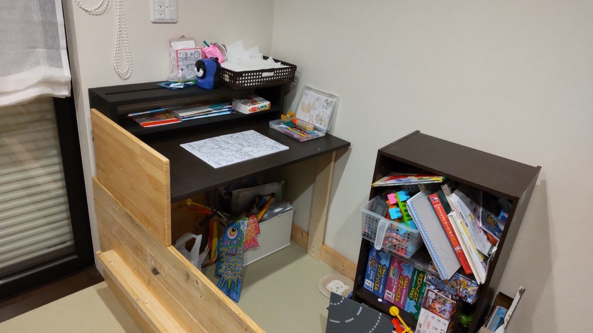 奥には工作が出来る様に机もあります。机の横には敵襲(B太からのちょっかい)を防ぐための壁も搭載。